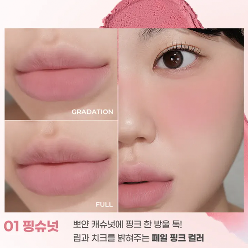 Sävy 01 Pink Cashew Nut on vaalea, pehmeä cashewpähkinän sävyinen pinkki, joka tuo kasvoille luonnollista lämpöä ja raikkautta. Se on helposti lähestyttävä ja imarteleva sävy, joka sopii monille ihonsävyille ja toimii täydellisesti huulilla, poskilla tai molemmissa.