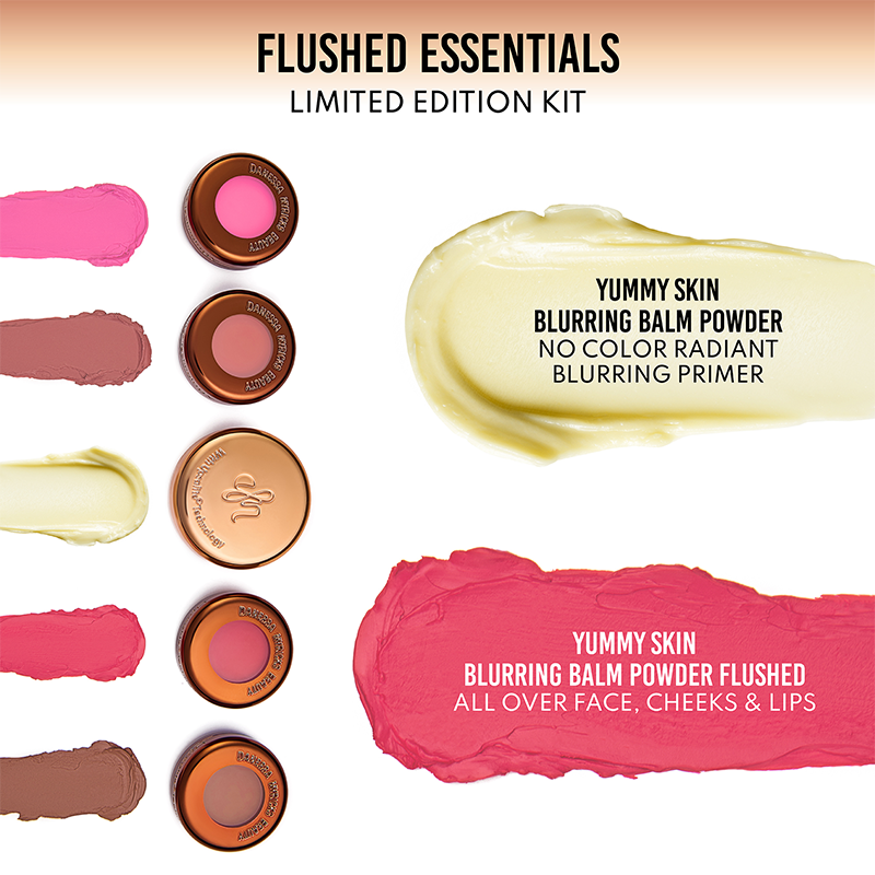 Danessa Myricks Beauty Yummy Skin Flushed Essentials: Blush & Lip Kit on täydellinen setti, joka kokoaa yhteen brändin palkitut ja rakastetut Blurring Balm Powder -klassikot. Setti sisältää neljä matkakokoista Blurring Balm Powder Flushed -poskipunaa sekä Universal Radiant -version, joka tuo iholle luonnollista hehkua ja blurraavan viimeistelyn.