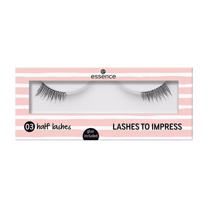 Essence Lashes To Impress 03 Half Lashes -irtoripset takaavat pitkät ja näyttävät ripset! Irtoripset kiinnitetään ripsien ulkonurkkaan korostamaan ja tuuheuttamaan omia ripsiä. Puoliripsien ansiosta saat silmiisi luonnollisen, kissamaisen ilmeen. Paketissa on mukana ripsiliima.
