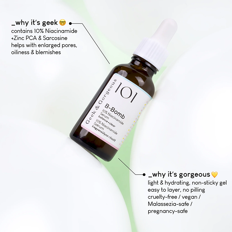 Geek & Gorgeous B-Bomb on huolellisesti kehitetty seerumi, joka hyödyntää 10% niasiiniamidin ja sinkki-PCA:n yhdistelmää. Tämä seerumi on suunniteltu erityisesti tasapainottamaan ihoa, vähentämään epäpuhtauksia ja kirkastamaan ihon sävyä. Niasiiniamidi, eli B3-vitamiini, on tunnettu sen monipuolisista hyödyistä iholle. Se auttaa säätelemään talintuotantoa, vähentää laajentuneiden ihohuokosten näkyvyyttä ja tasoittaa ihon sävyä.