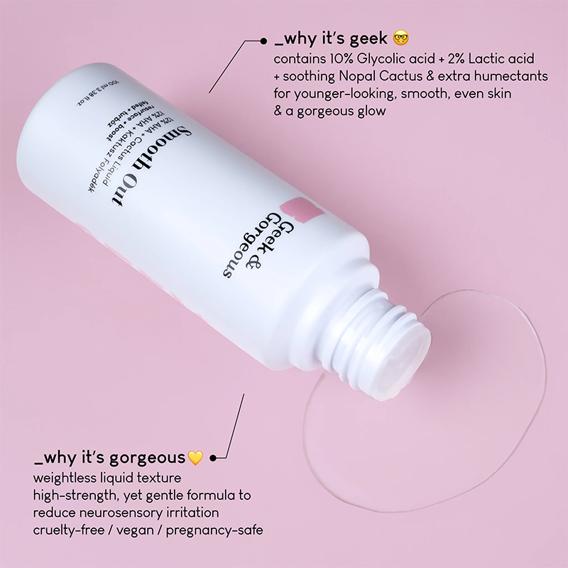 Geek & Gorgeous Smooth Out on tehokas kemiallinen kuorinta, joka on suunniteltu erityisesti taistelemaan ikääntymisen merkkejä vastaan tehden ihosta hyvinvoivan ja nuorekkaamman näköisen. Tämä kuorinta sisältää 10% glykolihappoa ja 2% maitohappoa, jotka yhdessä kuorivat ihoa hellävaraisesti mutta perusteellisesti, auttaen poistamaan kuolleita ihosoluja ja edistämään solujen uusiutumista. Lisäksi kuorinta sisältää nopal-kaktusuutetta, joka rauhoittaa ja kosteuttaa ihoa.