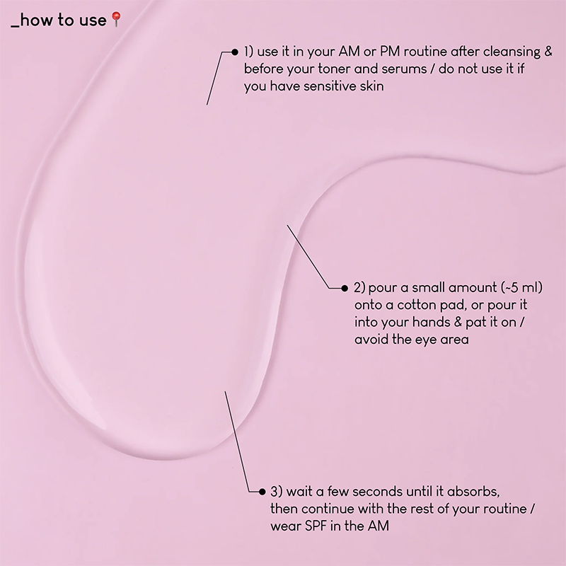 Käytä kuorintaa ihon puhdistuksen jälkeen samaan tapaan kuin kasvovettä: ota pieni määrä tuotetta kämmenille ja painele se puhdistetulle iholle hellästi. Odota, kunnes se on imeytynyt (pese sillä välin hampaat ✨) ennen kuin jatkat ihonhoitorutiiniasi seuraavalla tuotteella. Vältä silmänympärysihoa.