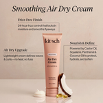 KITSCH Smoothing Air Dry Cream tekee ilmakuivauksesta ylellisen helppoa ja antaa hiuksille viimeistellyn lopputuloksen kuin suoraan kampaamosta. Kevyt, jätettävä hoitovoide korostaa hiusten luonnollista tekstuuria ja pitää pörröisyyden kurissa jopa 24 tunnin ajan. Risiiniöljyn, skvalaanin ja kookosöljyn yhdistelmä lukitsee kosteuden hiuksiin ja jättää ne pehmeiksi, sileiksi ja kosketeltavan luonnollisiksi ilman raskasta tunnetta.