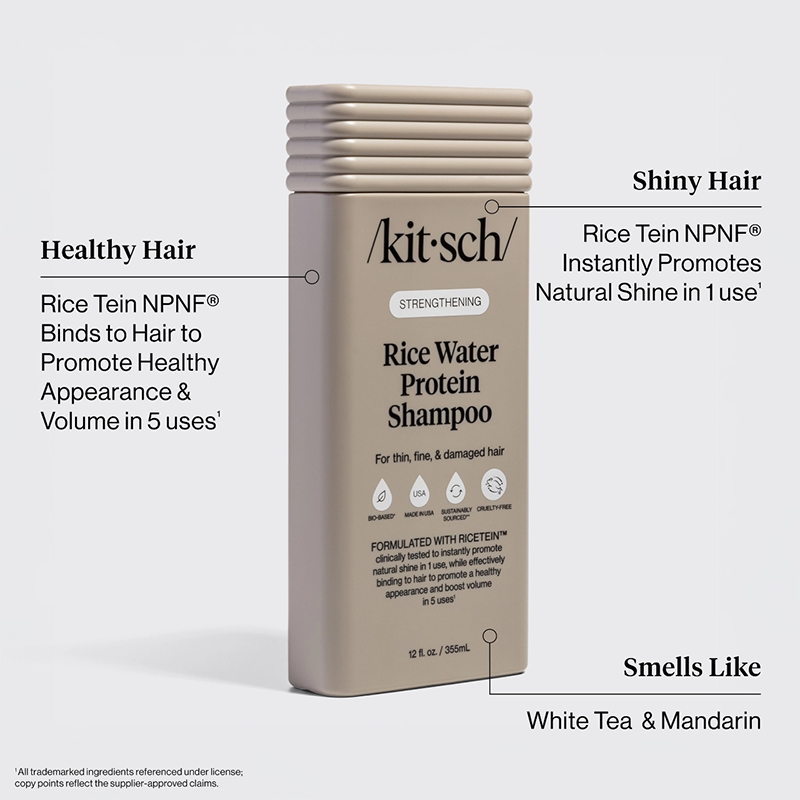 KITSCH Strengthening Rice Water Shampoo on vahvistava shampoo, joka on suunniteltu erityisesti ohuille, hennoille ja vaurioituneille hiuksille. Riisipohjainen Rice Tein NPNF® -aktiivi tuo hiuksiin välitöntä luonnollista kiiltoa sekä lisää volyymia. Shampoo puhdistaa hiukset hellävaraisesti mutta tehokkaasti, jättäen ne kevyiksi, ilmaviksi ja vahvemmiksi ilman kuivattavaa tunnetta.