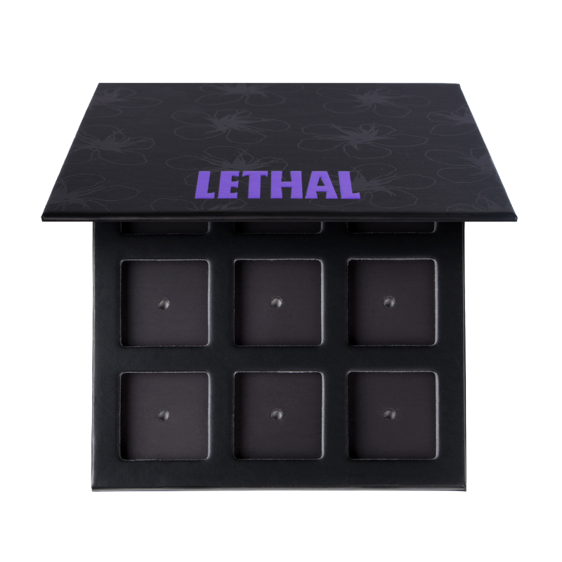 Lethal Cosmetics MAGNETIC Customizable Palette 9 on kestävä luomiväripaletti, johon mahtuu 9 kappaletta Lethal Cosmeticsin yksittäisiä luomivärejä. Magneetin ansiosta ne suorastaan liukuvat paikalleen ja pysyvät hyvin kiinni. Paletin materiaalin ansiosta se on helppoa ja vaivatonta puhdistaa. Paletissa on peili.