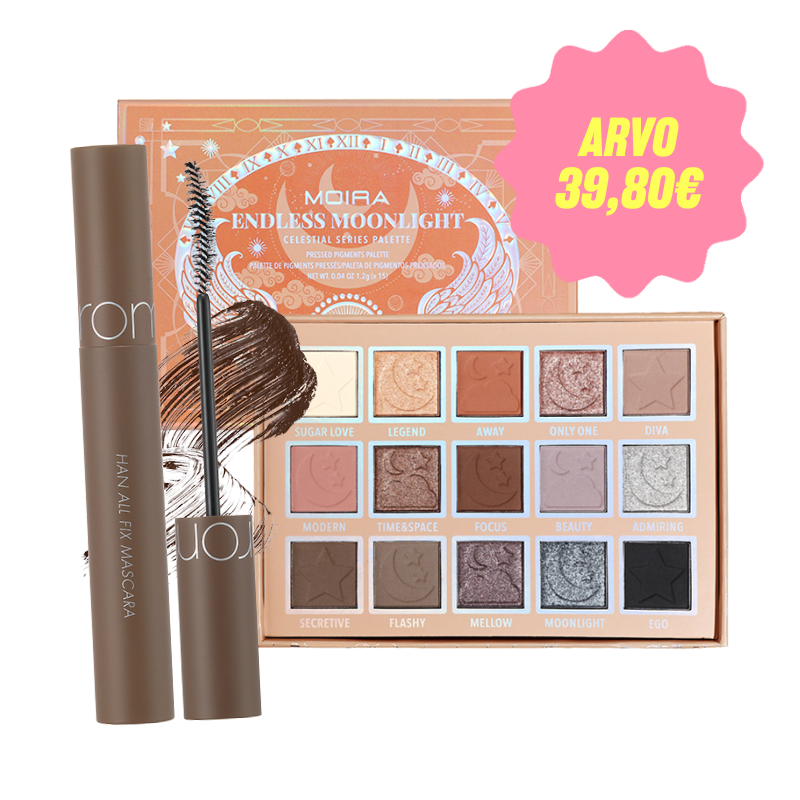 MOIRA Endless Moonlight Eyeshadow Palette sisältää pehmeitä, helposti häivytettäviä sävyjä, joilla saat aikaan sekä luonnollisen arkilookin että hieman näyttävämmän iltameikin. Rom&nd Han All Fix Mascara L03 Long Hazel viimeistelee katseen tuomalla ripsiin pituutta ja siisteästi erottelua pehmeän ruskeassa sävyssä, joka sopii erityisen hyvin vaaleille ja neutraaleille sävyille, mutta toimii kauniisti kaikilla.