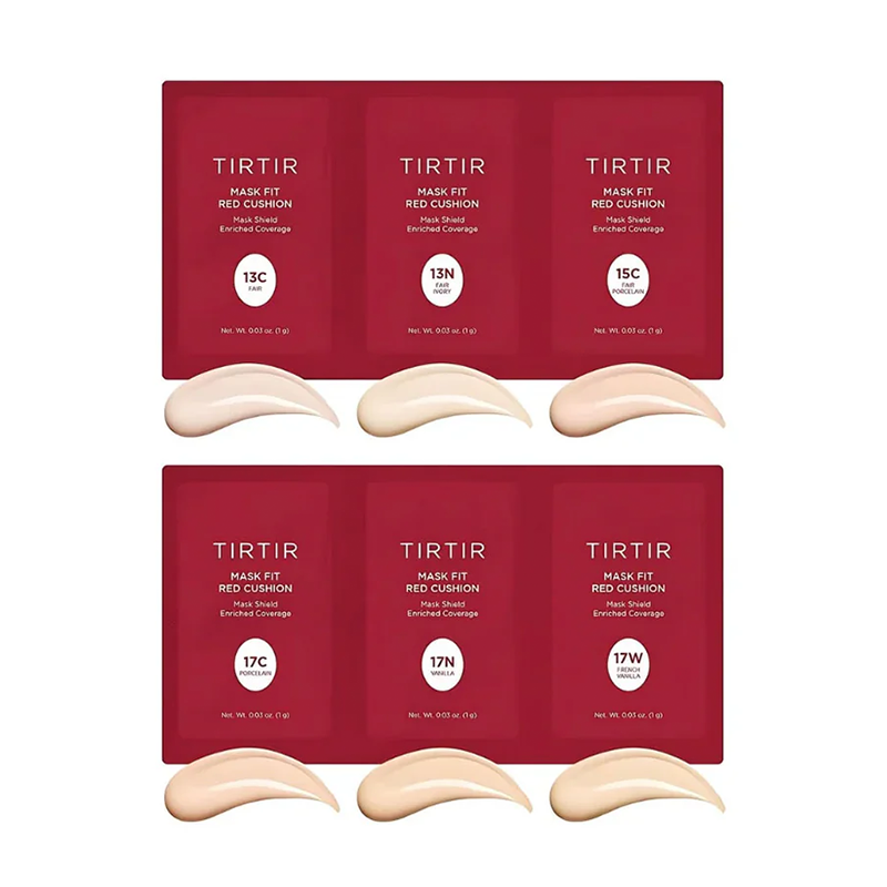 TIRTIR Mask Fit Red Cushion Foundation Trial Kit tarjoaa täydellisen mahdollisuuden kokeilla palkittua Mask Fit Red Cushion -tyynymeikkivoidetta ja löytää ihollesi sopiva sävy. Tämä kokeilupakkaus sisältää pienet testerit kuudesta vaaleasta sävystä: 13C Fair, 13N Fair Ivory, 15C Fair Porcelain, 17C Porcelain, 17N Fair Vanilla, 17W French Vanilla.
