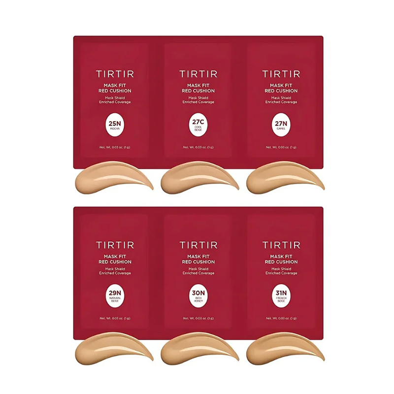 TIRTIR Mask Fit Red Cushion Foundation Trial Kit tarjoaa täydellisen mahdollisuuden kokeilla palkittua Mask Fit Red Cushion -tyynymeikkivoidetta ja löytää ihollesi sopiva sävy. Tämä kokeilupakkaus sisältää pienet testerit kuudesta vaaleasta sävystä: 25N Mocha, 27C Cool Beige, 27N Camel, 29N Natural Beige, 30N Rich Honey, 31N French Beige.